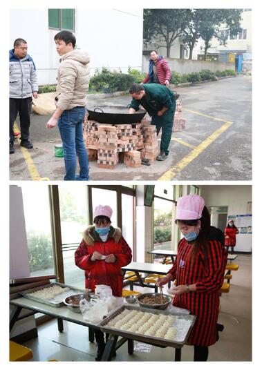 早上8點,同事們興致勃勃地搬來了磚,搭起了灶,燉起了豬肉湯。廚房的同事們也不閑著,個個都是包餃子能手!