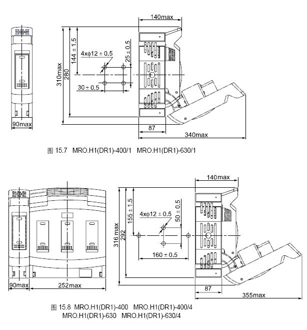 開關(guān)有底座和罩殼(載熔裝置)兩部分組成,呈封閉結(jié) 構(gòu),正面操作,通過罩殼上的透明板,可以直接觀察配裝的熔 斷體額定數(shù)據(jù)及指示件的動(dòng)作狀態(tài),開關(guān)配裝相應(yīng)尺碼的熔斷 體;其中MRO.H1(DR1)-100/1 為單極,可相互拼裝,分別派 生為三、四極,可配裝000 尺碼的熔斷體,結(jié)構(gòu)經(jīng)濟(jì),緊湊, MRO.H1(DR1)-160/1 為單極和MRO.H1(DR1)-160 為三極并列 結(jié)構(gòu),兩種結(jié)構(gòu)都能配裝000 和00 兩種尺碼的熔斷體;MRO. H1(DR1)-250/1、MRO.H1(DR1)-400/1、MRO.H1(DR1)-630/1 為單極和MRO.H1(DR1)-250、MRO.H1(DR1)-400 、MRO. H1(DR1)-630 為三極并列結(jié)構(gòu),分別配裝尺碼為1、2、3 的熔斷體。 以上的三極與同型號(hào)的單極拼裝,可派生為四極。 開關(guān)具有體積小巧、使用安全可靠、熔斷體卸裝方便、操作 力小等優(yōu)點(diǎn)。