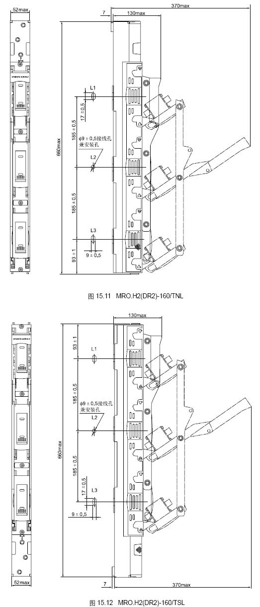 開關(guān)由底座和罩殼( 載熔裝置) 兩部分組成,呈三相封閉式 結(jié)構(gòu),正面操作,通過罩蓋上的透明板,可以直接觀察配裝的熔 斷體額定數(shù)據(jù)及指示件動作狀態(tài)。 開關(guān)安裝方式:開關(guān)實施模塊化設(shè)計。MRO.H2(DR2)-160/L 寬度為52mm,利用開關(guān)的進(jìn)線可以直接安裝在185mm 的母排 系統(tǒng)上,分為上出線或下出線二種型式,可三極同時分合,也可 三相單獨分合,可以配裝尺碼為000 或00 任一種熔斷體。 MRO.H2(DR2)-400/MRO.H2(DR2)-250 寬度為102mm,利 用開關(guān)的進(jìn)線可以直接安裝在185mm 的母排系統(tǒng)上,也可以利 用二個12x18 的安裝孔固定在支架上,二種安裝方式都具有上出 線或下出線二種型式,可三極同時分合,也可三極單獨分合,配 裝尺碼為1 或2 的熔斷體;MRO.H2(DR2)-630 寬度為102mm, 利用開關(guān)的進(jìn)線可以直接安裝在185mm 母排系統(tǒng)上,也可以利 用二個12x18 的安裝孔固定在支架上,二種安裝方式都具有上出 線或下出線二種型式,可三極同時分合,也可三極單獨分合,配 裝尺碼為3 的熔斷體; 開關(guān)具有占用安裝空間小、使用安全可靠、熔斷體裝卸方便、 操作力小等優(yōu)點。
