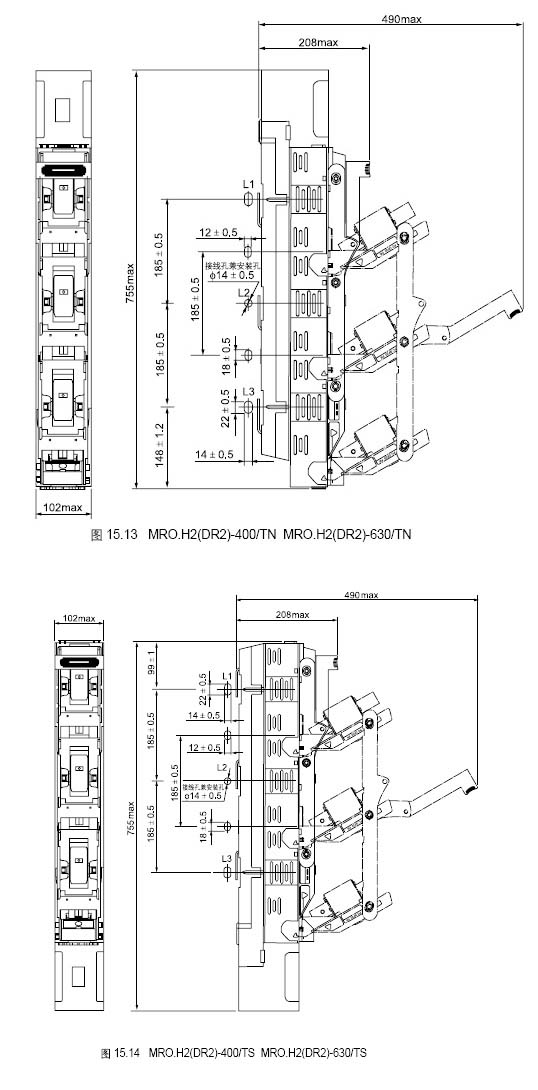 開關(guān)由底座和罩殼( 載熔裝置) 兩部分組成,呈三相封閉式 結(jié)構(gòu),正面操作,通過罩蓋上的透明板,可以直接觀察配裝的熔 斷體額定數(shù)據(jù)及指示件動作狀態(tài)。 開關(guān)安裝方式:開關(guān)實施模塊化設(shè)計。MRO.H2(DR2)-160/L 寬度為52mm,利用開關(guān)的進線可以直接安裝在185mm 的母排 系統(tǒng)上,分為上出線或下出線二種型式,可三極同時分合,也可 三相單獨分合,可以配裝尺碼為000 或00 任一種熔斷體。 MRO.H2(DR2)-400/MRO.H2(DR2)-250 寬度為102mm,利 用開關(guān)的進線可以直接安裝在185mm 的母排系統(tǒng)上,也可以利 用二個12x18 的安裝孔固定在支架上,二種安裝方式都具有上出 線或下出線二種型式,可三極同時分合,也可三極單獨分合,配 裝尺碼為1 或2 的熔斷體;MRO.H2(DR2)-630 寬度為102mm, 利用開關(guān)的進線可以直接安裝在185mm 母排系統(tǒng)上,也可以利 用二個12x18 的安裝孔固定在支架上,二種安裝方式都具有上出 線或下出線二種型式,可三極同時分合,也可三極單獨分合,配 裝尺碼為3 的熔斷體; 開關(guān)具有占用安裝空間小、使用安全可靠、熔斷體裝卸方便、 操作力小等優(yōu)點。