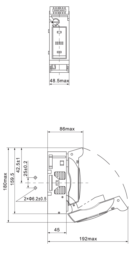 a、開關有底座和罩殼(載熔裝置)兩部分組成,呈封閉結構,正面操作,通過罩殼上的透明板,可以直接觀察配裝的熔斷體額定數(shù)據(jù)及指示件的動作狀態(tài),開關配裝相應尺碼的熔斷體;